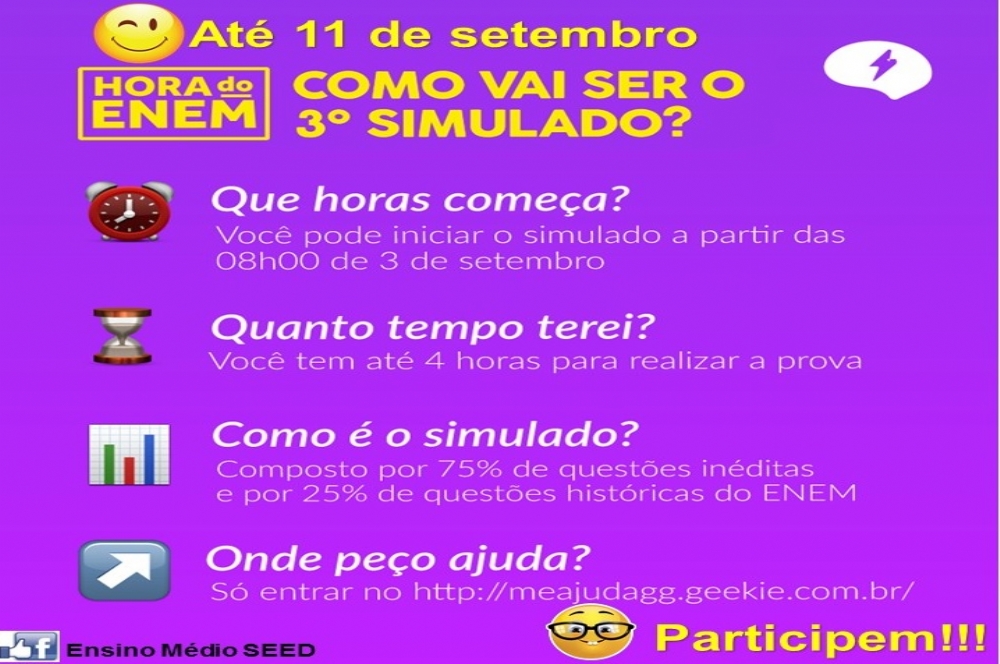 Estudantes de todo o Brasil poderão, até o próximo domingo, 11, fazer o simulado Hora do Enem, prova preparatória para o Exame Nacional do Ensino Médio (Enem) que é oferecida de forma gratuita. Será a terceira edição do simulado, que é realizado pelo Ministério da Educação (MEC) e desenvolvida pelo Geekie Games.