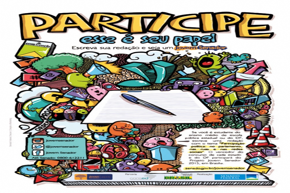 Os alunos de ensino médio das escolas da rede estadual de ensino poderão participar do 8º Concurso de Redação do Senado, iniciativa do projeto Jovem Senador, que tem como objetivo proporcionar aos estudantes do ensino médio das escolas públicas estaduais e do Distrito Federal, que tenham até 19 anos de idade, conhecimento acerca da estrutura e do funcionamento do Poder Legislativo no Brasil.