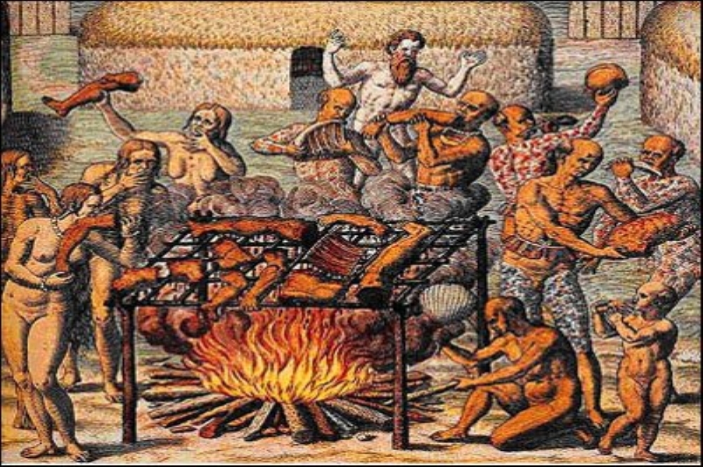 | Antropofagia. Exemplo dos mais conhecidos para expressar a incivilidade indígena ou a sofisticação das suas crenças. (Gravura em metal de Theodor de Bry, 1592). |