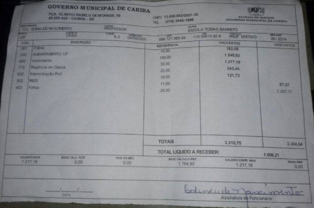 O Portal Infonet teve acesso a um contracheque de um professor recebeu apenas R$ 1.006,21, tendo como salário bruto R$ 2.304,54. "Ele cortou salário de professor que está em licença maternidade, professor que faz aniversário agora, de profissional que receberia o 13º salário. Tem professor que recebeu R$ 19. O sentimento é de desespero, porque são pais e mães de família que vão passar fome. Imagine você trabalhar e não receber nada. Teve professor que está com salário negativo no banco, devendo, porque pegou empréstimo", disse