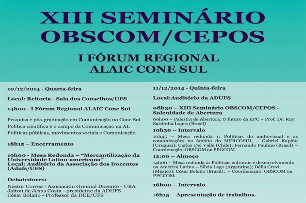 Entre os dias 10 e 11 de dezembro, Aracaju sediará o XIII Seminário OBSCOM/CEPOS e o I Fórum Regional ALAIC Cone Sul. Os eventos, que ocorrerão nas dependências da Universidade Federal de Sergipe (UFS), terão como objetivo comemorar os 20 anos de criação do Observatório de Economia e Comunicação da Universidade Federal de Sergipe (OBSCOM/UFS), os 15 anos da Rede de Economia Política das Tecnologias da informação e da Comunicação (Rede EPTIC) e da Revista Eptic Online e os 12 anos de fundação do grupo “Comunicação, Economia Política e Sociedade (CEPOS)”.