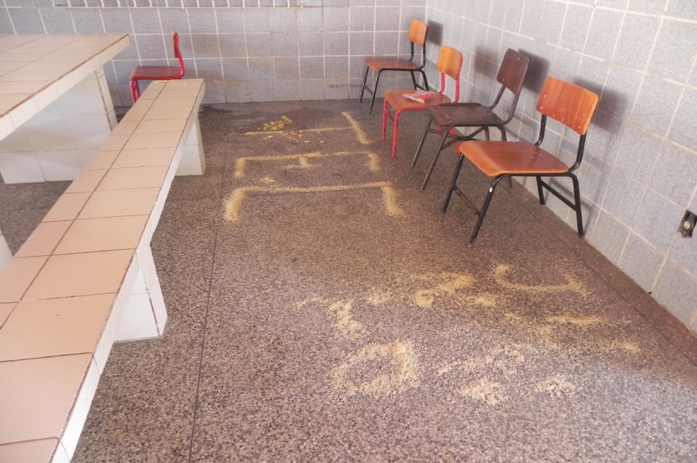 Os assaltantes deixaram vários pacotes de biscoito e arroz espalhados na quadra da escola, local por onde entraram. No muro há várias marcas de pés e uma cadeira usada para subir no muro e levar os alimentos. Na área do refeitório, os assaltantes escreveram a sigla TEC com grãos de arroz.