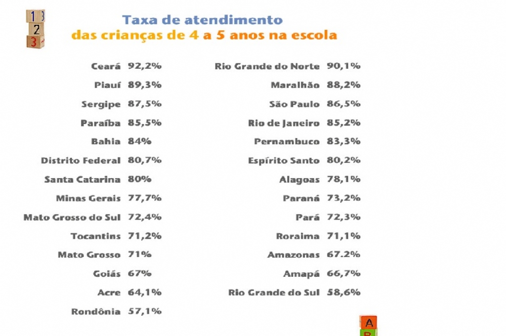 Entre os estados, apenas o Ceará e o Rio Grande do Norte têm taxas de atendimento na pré-escola superiores a 90%. Na outra ponta, Rondônia e o Rio Grande do Sul têm menos de 60% das crianças de 4 e 5 anos matriculadas. No total, 14 unidades da Federação têm índices de atendimento inferiores à média nacional.