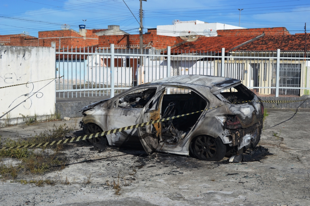 | Situação em que ficou o carro da professora Andreia após incendiado |