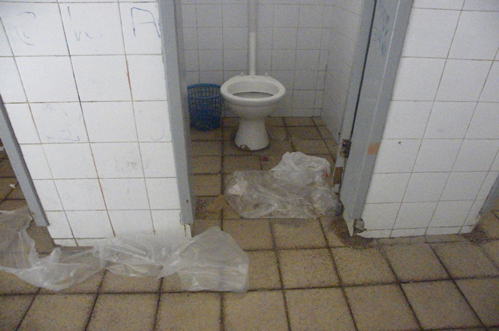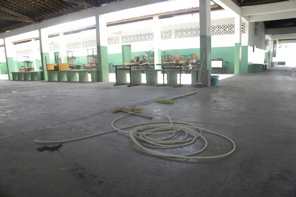 No pátio, vassouras, mangueiras e baldes estão espalhados para a limpeza do local. Os sanitários não podem ser limpos, pois estão ou entupidos e com o escoamento sem funcionar. Segundo informações de funcionários, os bebedouros foram danificados pelos alunos, que estavam bebendo água das torneiras.