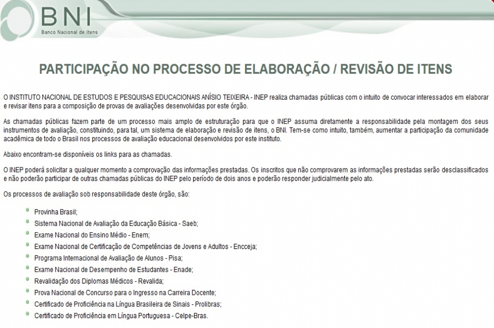 Profissionais, professores e pesquisadores de todo o Brasil interessados em participar da seleção e credenciamento para o Banco de Colaboradores do Banco Nacional de Itens (BC-BNI) como tradutores de língua inglesa, francesa ou espanhola têm de 1º a 30 de dezembro para se inscrever. As regras estão no edital nº 23/2015.