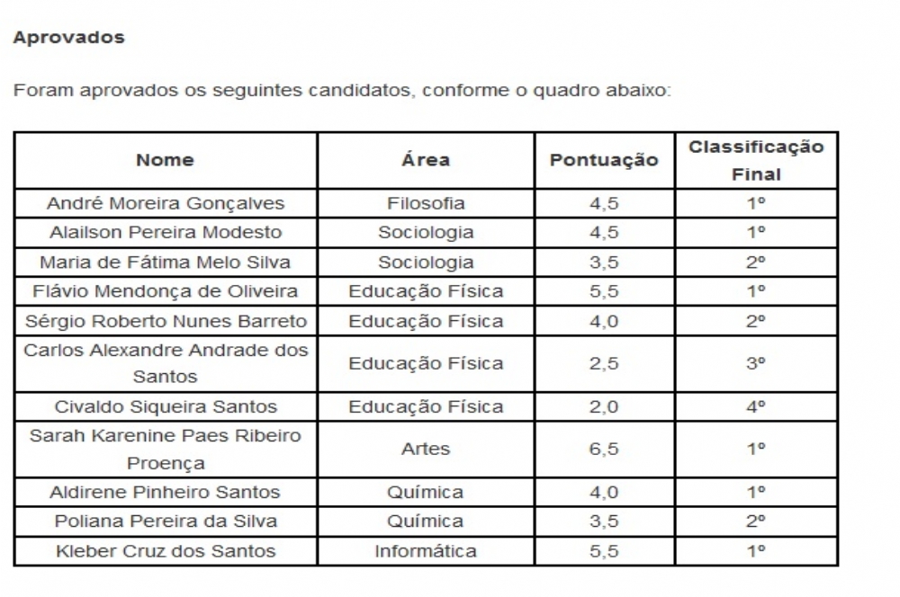 Estão contempladas com vagas as disciplinas: Filosofia, Sociologia, Educação Física, Química, Artes e Informática.