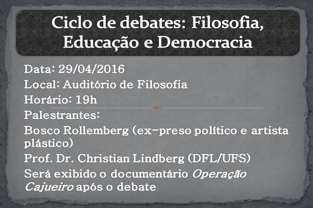 A mesa será composta pelo professor doutor Christian Lindberg, do Departamento de Filosofia, e pelo artista plástico e ex-preso político Bosco Rollemberg. Na ocasião será exibido o documentário Operação Cajueiro, do professor mestre Werden Tavares, do Departamento de Comunicação Social.