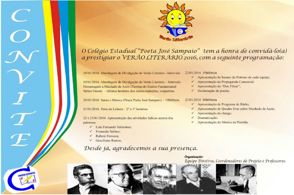 Alunos do Colégio Estadual Poeta José Sampaio, no município da Carmópolis, participarão na próxima semana do Verão Literário 2016. O evento terá como público os estudantes do ensino médio (regular e EJA) e ensino fundamental (séries finais) e acontecerá no período de 18 a 23 de janeiro, contando com uma extensa programação de atividades literárias, culturais e artísticas.