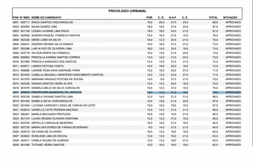Em junho de 2012, o Portal Infonet noticiou o nome da prefeitura de Japoatã na lista dos aprovados para o cargo de psicólogo, ocupando a 17ª vaga com 69,0 pontos no concurso de Pacatuba.