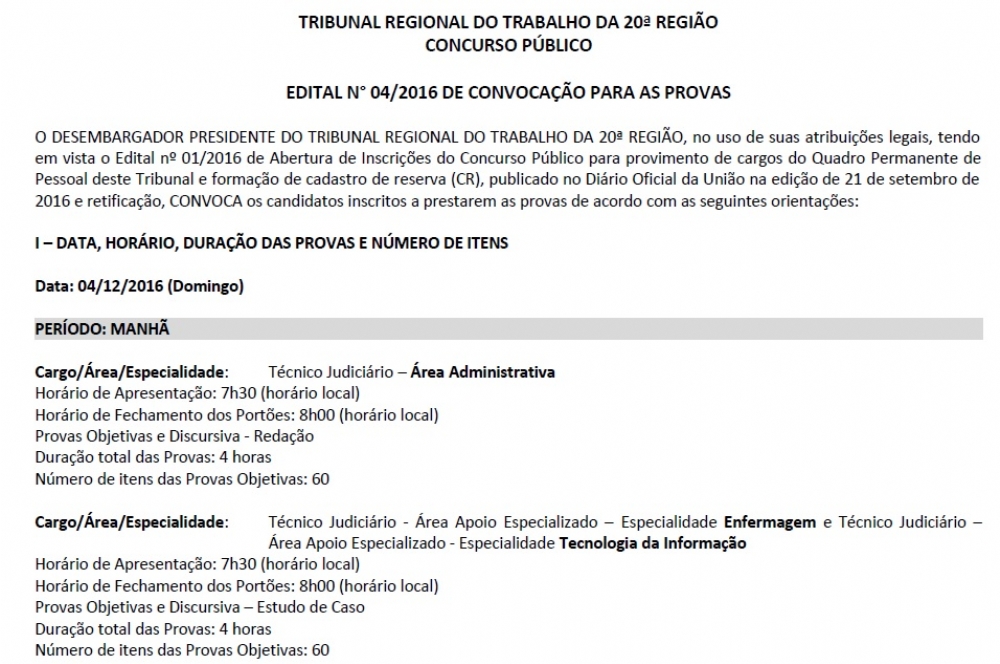 O TRT20 informa, ainda, que somente o Tribunal dispõe de autoridade para fornecer informações oficiais sobre a realização do concurso, de forma que quaisquer outras informações contrárias não procedem. Todas as informações sobre o concurso estão disponíveis no site do Tribunal.