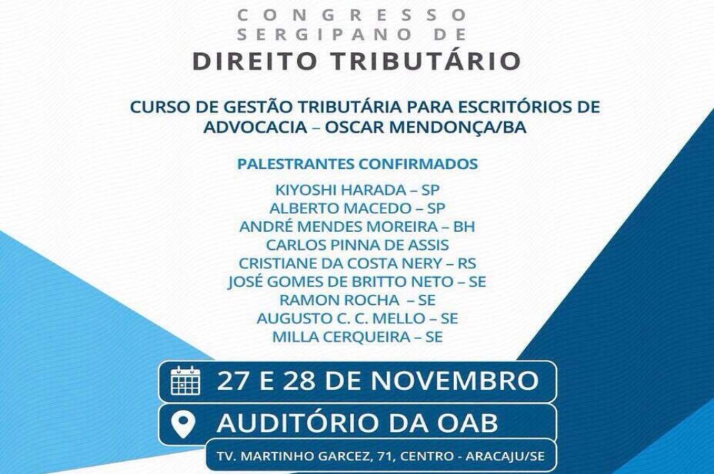Discutir as novas temáticas relacionadas ao direito tributário. Esse é o principal objetivo do Congresso Sergipano de Direitos Tributários, a ser realizado entre os dias 27 e 28 de novembro, no auditório da Ordem dos Advogados do Brasil, Seccional Sergipe – OAB/SE. O evento reunirá palestrantes que são referência na temática por sua atuação no estado de Sergipe e no Brasil.