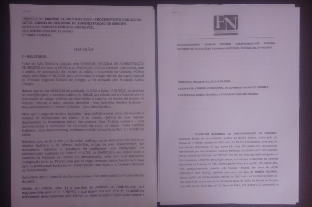 O Conselho Regional de Administração de Sergipe (CRA-SE) protocolou no início de outubro, uma ação judicial de impugnação ao edital do concurso público 01/2015 do Tribunal Regional Eleitoral de Sergipe (TRE/SE). O pedido liminar contido na Ação foi indeferido pela juíza da 1ª Vara Federal de Aracaju, Telma Maria Santos Machado.