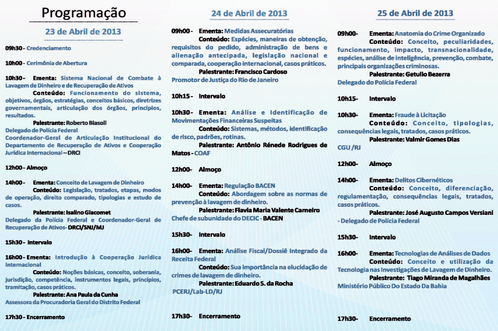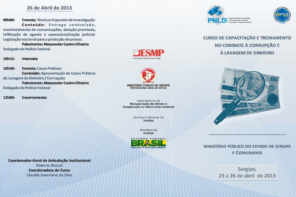 O curso, que tem por objetivo disseminar informações na prevenção e combate à lavagem de dinheiro e corrupção, está inserido no Programa Nacional de Capacitação e Treinamento para o Combate à Corrupção e à Lavagem de Dinheiro – PNLD, resultado de uma das ações da Estratégia Nacional de Combate à Corrupção e à Lavagem de Dinheiro – ENCCLA. Poderão participar os Membros do Ministério Público (Estatual de Federal), do Poder Judiciário (Estadual e Federal), da Secretaria de Segurança Pública, da Polícia Federal, da OAB, da Defensoria Pública (Estadual e Federal), Advocacia Geral da União, Controladoria Geral da União, Tribunal de Contas da União e Tribunal de Contas do Estado.