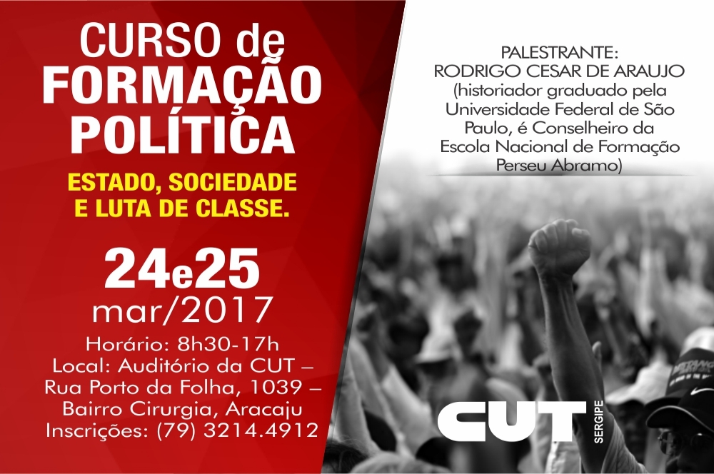 A Diretoria de Formação da Central Única dos Trabalhadores em Sergipe (CUT-SE) realiza nesta sexta e sábado (dias 24 e 25 de março) o Curso de Formação Política ‘Estado, sociedade e luta de classes’, aberto a dirigentes sindicais cutistas.