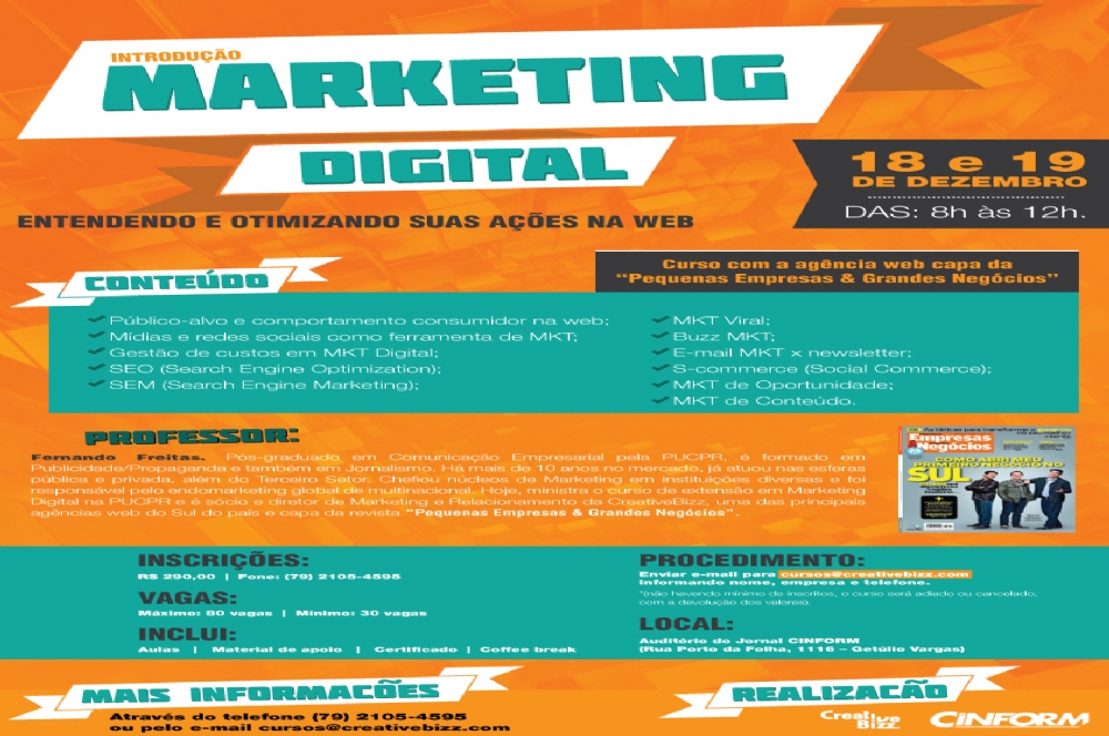 Foi pensando justamente em auxiliar o mercado nestas questões que a CreativeBizz, agência web especializada na estruturação de projetos de alto padrão na internet e que recentemente foi capa da revista “Pequenas Empresas & Grandes Negócios”, pensou um curso integralmente dedicado ao assunto. “São vários os pontos que os profissionais e até mesmo os empresários precisam saber, na hora de estruturar bem as ações de Marketing no ambiente virtual”, enfatiza Fernando Freitas, diretor de Marketing e Relacionamento da CreativeBizz. “A maioria dos cursos traz uma visão inconsistente e meramente teórica. Como nós ‘respiramos’ negócios digitais e temos neles a nossa rotina, nossa intenção é enriquecer a experiência dos participantes também com exemplos diretos”, completa ele, que também é professor do curso.