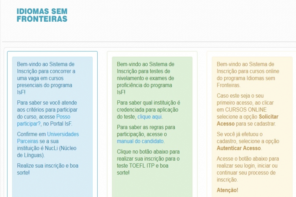 Estão abertas as inscrições para o curso online de francês oferecido pelo Programa Idioma sem Fronteiras (IsF). O chamado Français sans Frontières é oferecido em parceria com a Embaixada da França e a Aliança Francesa. As inscrições podem ser feitas até as 12h do dia 4 de fevereiro no site do programa.