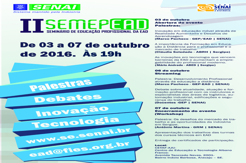 O Senai Sergipe realiza, entre 03 e 07 de outubro, o II Seminário de Educação Profissional da EAD com o tema “A importância da formação técnica em Educação a Distância para o profissional e o mercado de trabalho". O evento visa divulgar os cursos a distância ofertados pela instituição e promover um debate sobre as principais questões sobre a formação de nível técnico na educação à distância no atual cenário regional, orientando e preparando os futuros técnicos para atuarem na indústria sergipana.