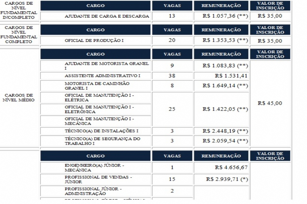 As vagas se dividem em: 26 para nível superior; 86 para candidatos de nível médio; 20 para quem possui nível fundamental completo e 13 para quem não completou o fundamental.