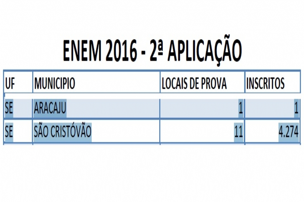 Neste final de semana ocorre à segunda aplicação de provas do Enem 2016. Em Sergipe, 4275 inscritos farão as provas em 12 locais. De acordo com o Ministério da Educação (MEC) serão 12 locais de provas, sendo um em Aracaju. A segunda aplicação foi necessária por causa das ocupações de escolas e instituições de ensino superior.