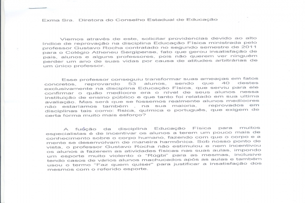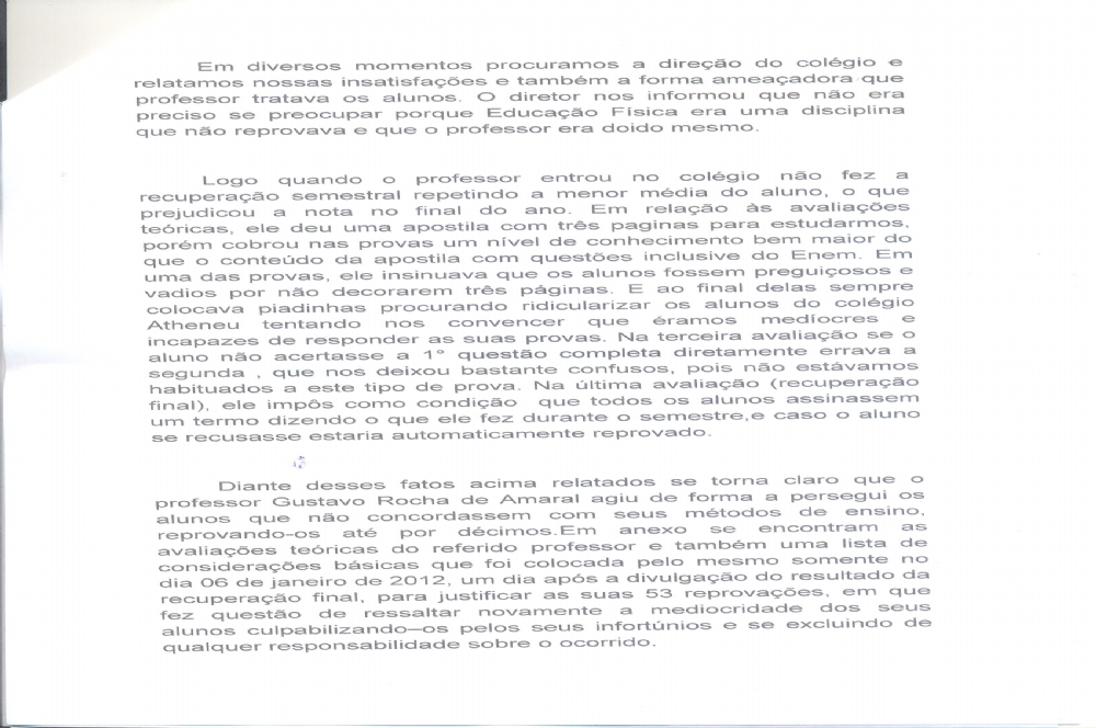 No documento, as estudantes acusam o professor de atitudes arbitrárias e reforçam que as reprovações foram frutos de ameaças. As alunas que foram ao MPE acusam o professor de perseguição e no documento afirmam que a direção da escola foi omissa em relação aos fatos narrados pelos alunos. O caso foi relatado em uma matéria no Portal Infonet, que disponibiliza também a íntegra do documento entregue ao MP.