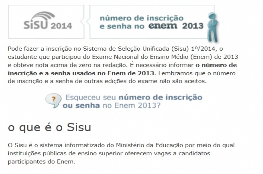 O estudante vai precisar do número de inscrição e da senha no Enem. Quem estiver sem esses dois números pode recuperá-los no site do exame. O estudante concorre às vagas disponíveis no Sisu com as notas no Enem, mas não é preciso tê-las em mãos no momento da inscrição. Quando o candidato insere no site o número de inscrição e a senha, o Sisu recupera, automaticamente, as notas obtidas no exame.