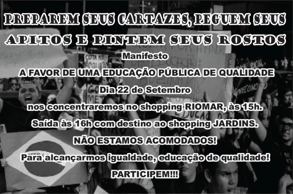 A concentração está marcada para às 15h na frente do Shopping Riomar, quando sairão em caminhada com cartazes, apitos e rostos pintados com destino ao Shopping Jardins.