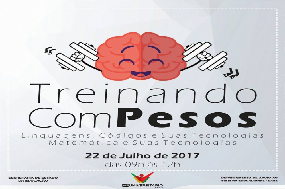 A Secretaria de Estado da Educação (Seed), por meio do Departamento de Apoio ao Sistema Educacional (Dase), realizará no próximo sábado, 22, mais uma edição do Treinando com Pesos. Nesta ação, os alunos terão a oportunidade de escolher qual área do conhecimento desejam reforçar durante a maratona de estudos para o Exame Nacional do Ensino Médio (Enem) e outros vestibulares, tendo como base o peso do curso que desejam a aprovação.