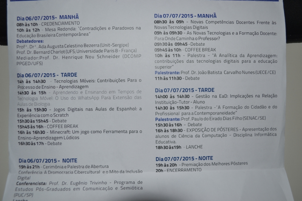 Ocorrerá nos dias 06 e 07 de Julho na Universidade Federal de Sergipe (UFS) o V Ciclo de Conferências TIC & Educação, evento de extensão e oficial do calendário da UFS produzido por alunos de mestrado e pós-graduação do grupo de pesquisa Gepied, do departamento de computação. Com o tema “Uso como intenção – Desuso como realidade”, haverá debates e palestras que vão discutir a utilização da tecnologia digital no processo de aprendizagem. Toda programação ocorrerá no auditório da Didática VI.