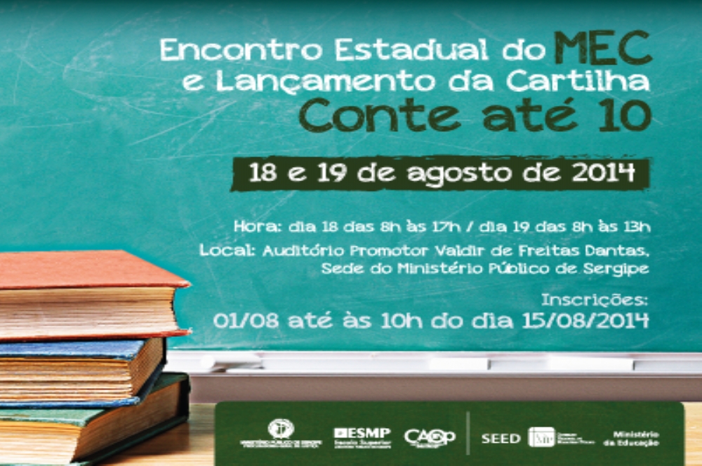 A Escola Superior do Ministério Público em parceria com o Centro de Apoio dos Direitos à Educação realizarão, nos dias 18 de agosto, das 8h às 17h, e 19 de agosto, das 08h às 13h, o evento: “Encontro Estadual do MEC e Lançamento da Cartilha Conte até 10”.