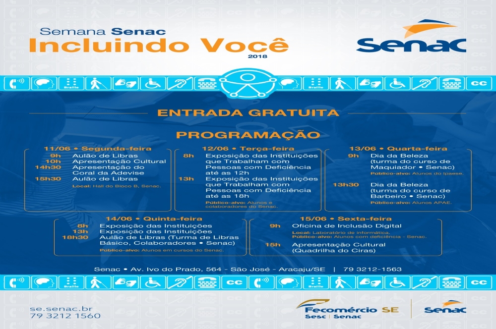 Para levar ao conhecimento dos alunos e da sociedade em geral as ações que realiza para a inclusão das pessoas com deficiência (PcD) em todas as atividades, bem como proporcionar às instituições que trabalham com esse público apresentarem seus trabalhos, o Senac Sergipe realiza, entre os dias 11 e 15 de junho, a “Semana Senac Incluindo Você”. Diversas atividades compõem a programação, tais como aulão de libras, oficina de inclusão digital e apresentações culturais.