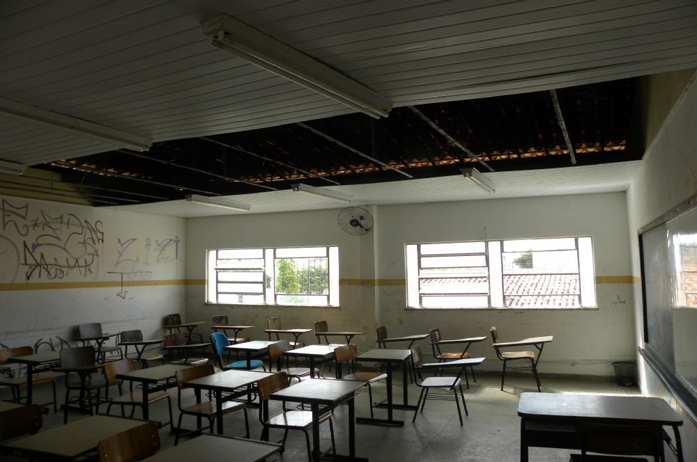 Em duas salas de aula, boa parte do forro caiu e dos três bebedouros da escola, apenas um funciona, sem contar com os computadores que estão apresentando problemas e a internet ainda não funciona.