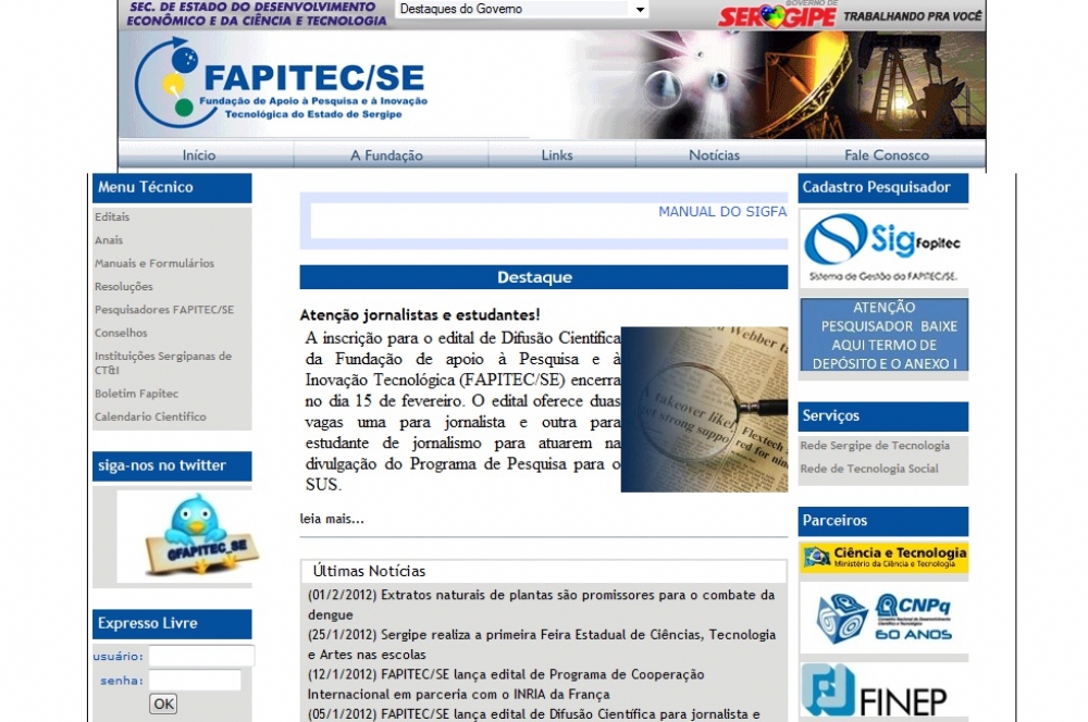 A inscrição para o edital de Difusão Científica da Fundação de apoio à Pesquisa e à Inovação Tecnológica (FAPITEC/SE) encerra no dia 15 de fevereiro. O edital oferece duas vagas uma para jornalista e outra para estudante de jornalismo para atuarem na divulgação do Programa de Pesquisa para o SUS. O valor da bolsa é 2.200 para o jornalista e R$ 400 para o estudante.