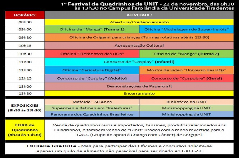 No próximo sábado,22, no Campus Farolândia da Universidade Tiradentes (Unit), acontece o 1° Festival de Quadrinhos da Unit, com atividades destinadas aos fãs e admiradores dessa forma de arte.