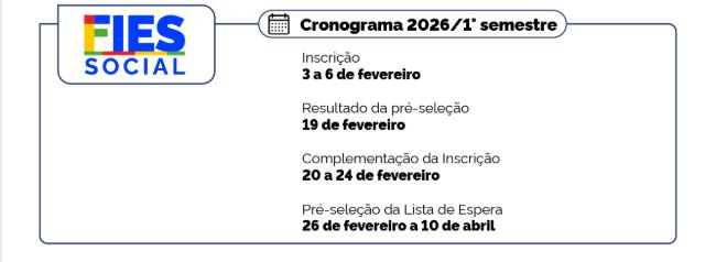 As inscrições para o Fundo de Financiamento Estudantil (Fies), referentes ao primeiro semestre de 2026, abrem na próxima semana, entre os dias 3 e 6 de fevereiro. Os candidatos já podem consultar as vagas ofertadas no Fies Seleção. O programa do Ministério da Educação (MEC) oferece financiamento para estudantes cursarem a educação superior em instituições privadas. A inscrição é gratuita e deve ser feita exclusivamente pelo Portal Único de Acesso ao Ensino Superior.