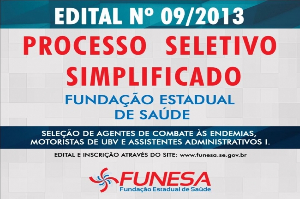 A Fundação Estadual de Saúde (Funesa) comunica a reabertura do edital nº 09/2013 para seleção de Agentes de Combate às Endemias, Motoristas de UBV e Assistentes Administrativos I. Os interessados deverão efetuar a inscrição de 9 a 22 de abril de 2014 através do link de acesso disponibilizado nos sites da Saúde e Funesa.