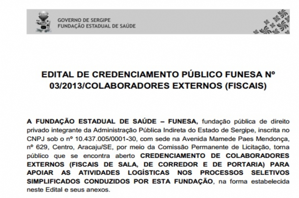 A Fundação Estadual da Saúde (Funesa) divulga os editais para credenciamento de colaboradores externos e professores. O edital nº 03/2013 visa a seleção de profissionais que apoiarão as atividades de logísticas dos processos seletivos simplificados conduzidos pela Fundação. Já o edital nº 04/2013 selecionará professores com formação na área da saúde, pedagogia, letras-português, matemática e informática para a elaboração e revisão de itens desses mesmos processos.