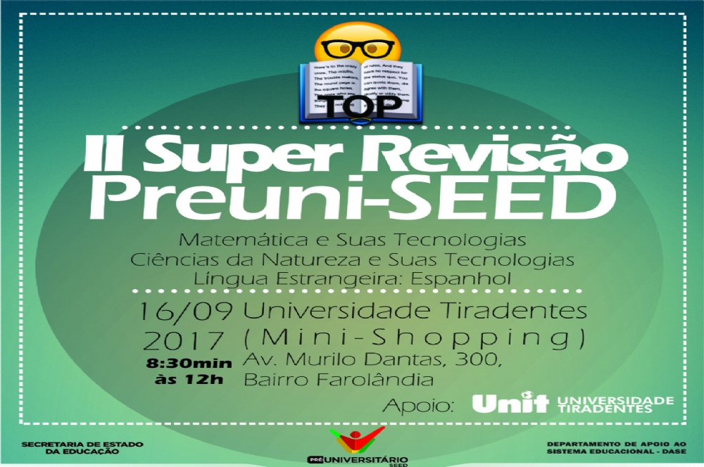 A Secretaria de Estado da Educação (Seed), por meio do Departamento de Apoio ao Sistema Educacional (Dase), promove neste sábado, 16, o II Super Revisão do Preuni Seed nos polos de Aracaju e Nossa Senhora da Glória, a partir das 8h30. Vão participar das revisões, os alunos do Pré-Universitário da Secretaria, que estão em fase de preparação para o Exame do Ensino Médio 2017 (Enem).
