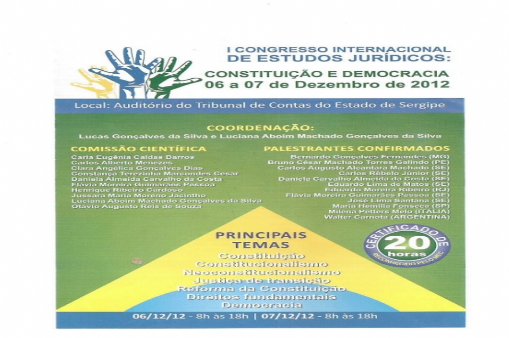 “Constituição e Democracia” são os principais temas do I Congresso Internacional de Assuntos Jurídicos que será realizado nos dias 06 e 07 de dezembro, no Auditório do Tribunal de Contas de Sergipe das 8h às 18h.