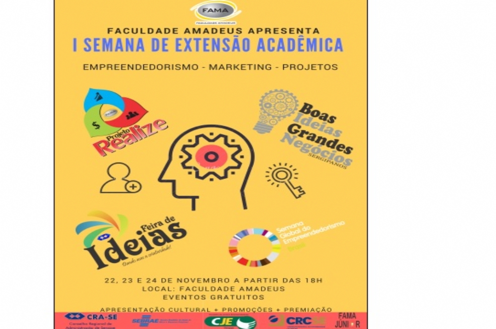 De 22 a 24 desse mês a partir das 18:30h na Faculdade Amadeus acontecerá I Semana de Extensão Acadêmica da Faculdade Amadeus. Serão três projetos de extensão das seguintes áreas: Empreendedorismo, Marketing e Gestão de Projetos. O evento faz parte da Semana Global de Empreendedorismo, que acontece em todo o mundo neste período e tem apoio do CJE/CONAJE.