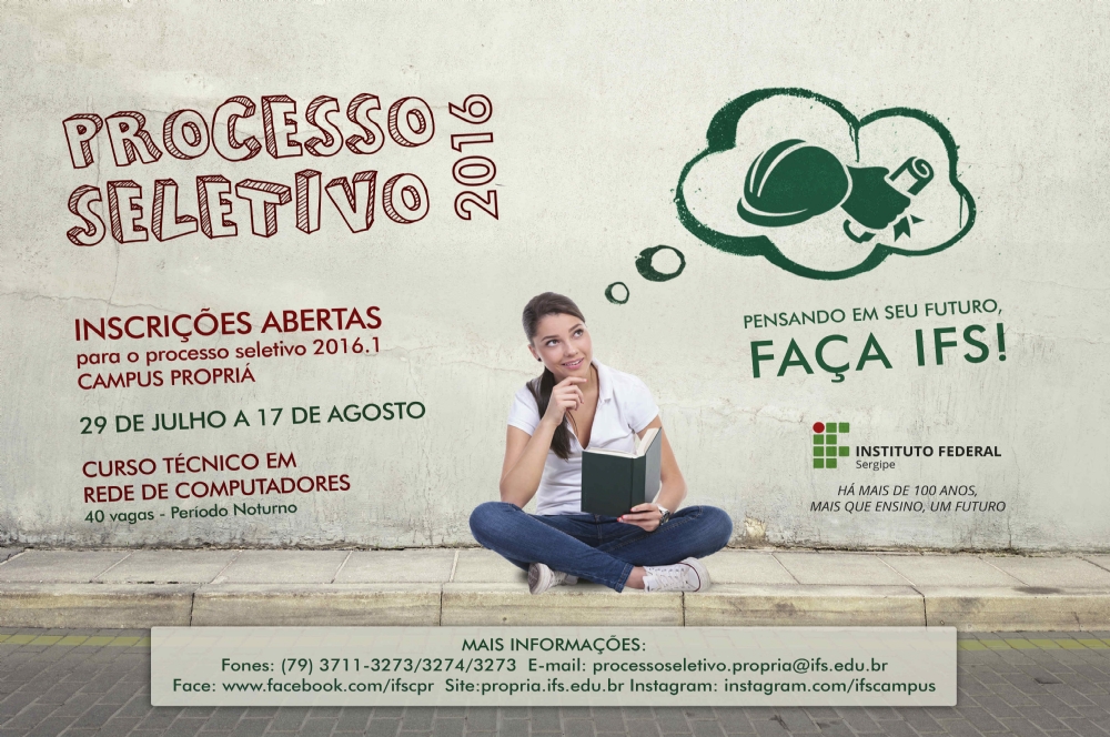 O Instituto Federal de Sergipe (IFS) – Campus Propriá está com inscrições abertas, até o dia 17 de agosto, para o processo seletivo 2016.1 do curso técnico subsequente Redes de Computadores. Estão sendo ofertadas 40 vagas no período noturno. Os interessados devem comparecer das 8h às 11h e das 13h às 16h à Coordenadoria de Registro Escolar (CRE) ou Gerência de Ensino (GEN) do Campus Propriá, situado na Rua Rotary, nº 330, Centro de Propriá.
