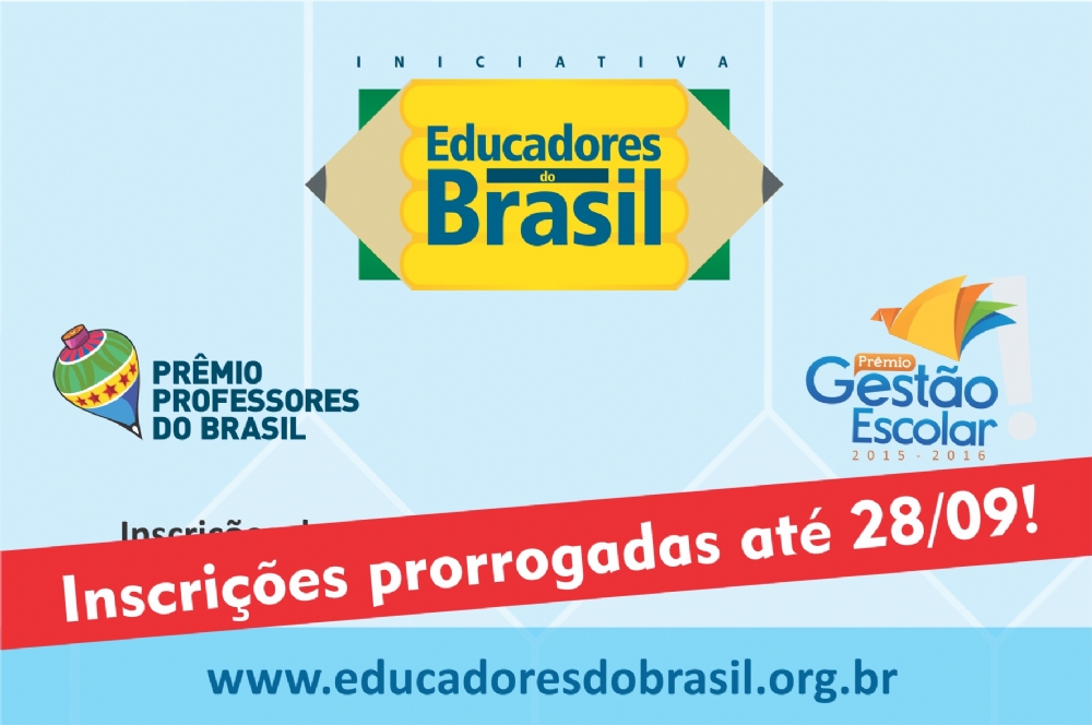 Como forma de ampliar a oportunidade de inclusão de professores e diretores, que por inúmeras circunstâncias regionais não conseguiram se inscrever e/ou completar os formulários de participação até a data inicialmente estabelecida, foi prorrogado até o próximo dia 28, para todas as categorias, o prazo para inscrições da Iniciativa ‘Educadores do Brasil', que terminaria nesta segunda-feira, 14.