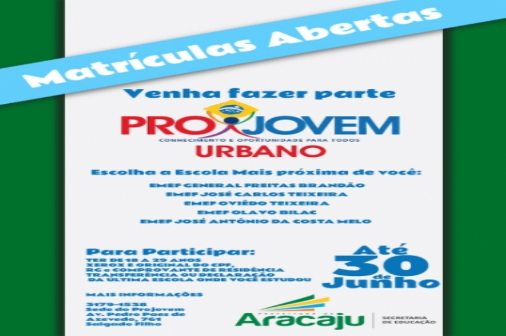 Com a finalidade de proporcionar a formação integral dos jovens entre 18 e 29 anos, o Programa Nacional de Inclusão de Jovens (Projovem), vinculado à Secretaria Municipal de Educação (Semed), já iniciou o processo de matrícula para o ano de 2013. As inscrições permanecem até o dia 30 de junho.