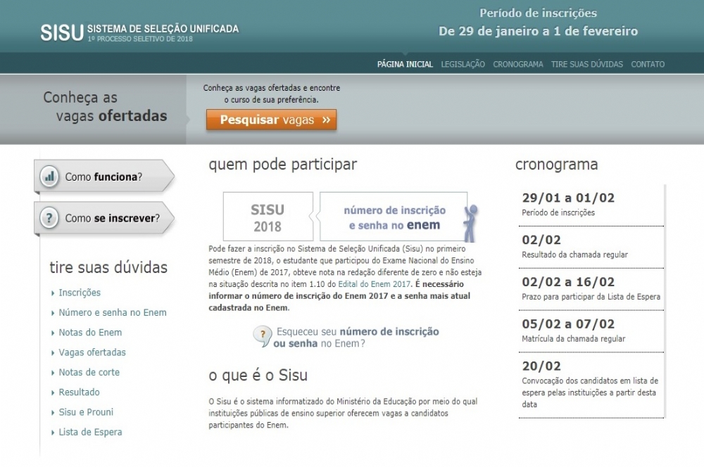 O Sisu é o sistema informatizado do MEC por meio do qual instituições públicas de educação superior oferecem vagas a estudantes com base nas notas obtidas no Exame Nacional do Ensino Médio (Enem). O processo ocorre duas vezes por ano e cada candidato pode fazer até duas opções de curso. Podem concorrer estudantes que tenham feito o Enem 2017 e obtido nota acima de zero na prova de redação.