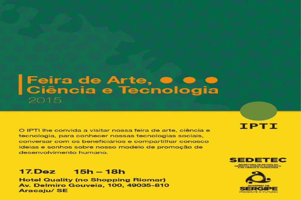 Acontece hoje,17, das 15h às 18h, no Hotel Quality (Shopping Riomar) acontece a Feira de Arte, Ciência e Tecnologia promovida pelo Instituto de Pesquisas em Tecnologia e Inovação (IPTI) em parceria com a Secretaria de Estado do Desenvolvimento Econômico e da Ciência e da Tecnologia (SEDETEC). O evento tem o objetivo de apresentar à comunidade e aos parceiros do Instituto os resultados gerados pelo IPTI e pela comunidade de Santa Luzia do Itanhy, em projetos que estão sendo desenvolvidos com os jovens sergipanos.