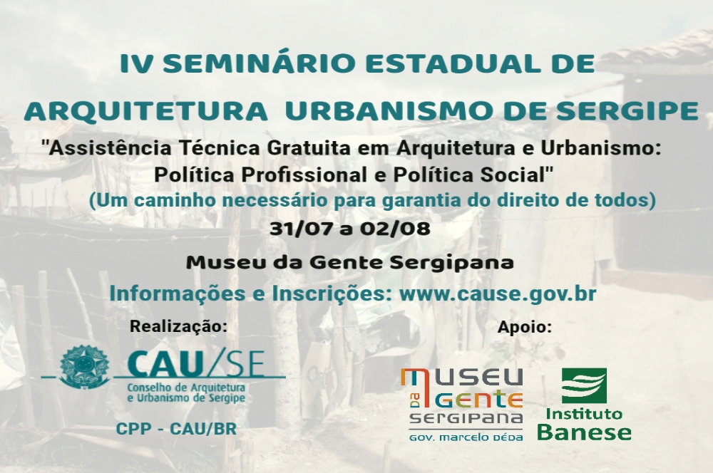 No dia 31 de Julho, o IV Seminário Estadual de Arquitetura e Urbanismo de Sergipe, será realizado no auditório do Museu da Gente Sergipana, a partir das 18h30.