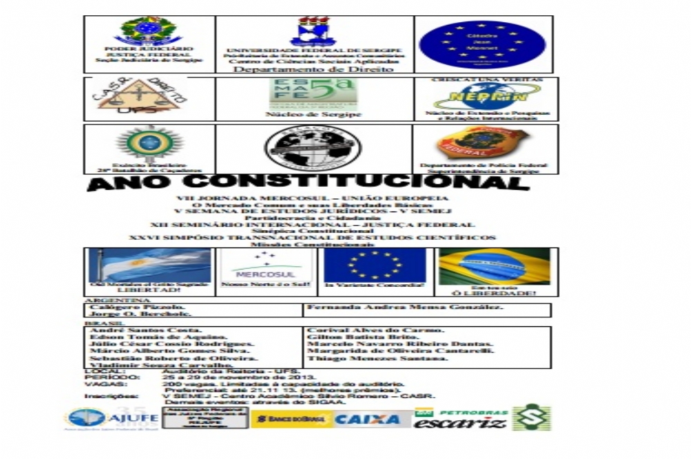A Justiça Federal de Sergipe (JFSE) e a Universidade Federal de Sergipe (UFS), com outros parceiros, realizarão a VII Jornada Mercosul – União Européia, o XXI Seminário Internacional – Justiça Federal e o XXVII Simpósio Transnacional de Estudos Científicos. Serão abordados os temas: Mercado Comum e suas Liberdades Básicas, Sinépica Constitucional e Missões Constitucionais.