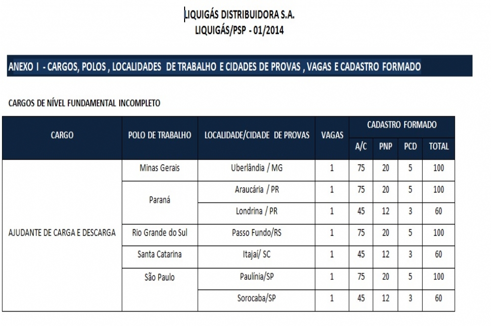 A Liquigás Distribuidora realiza neste segundo semestre o Processo Seletivo Público (PSP 01/2014) para o preenchimento de 50 vagas e a formação de cadastro de reserva em diferentes áreas e polos de trabalho no Brasil. O processo seletivo é voltado aos profissionais com níveis de escolaridade superior, médio, fundamental completo e fundamental incompleto.