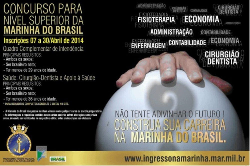Além deste Concurso, a DEnsM publicou dois outros Editais: Quadro Complementar de Intendentes (48 vagas) e Quadro de Cirurgiões-Dentistas (20 vagas), também com inscrições a partir de hoje (07/04) a 30 de abril de 2014.