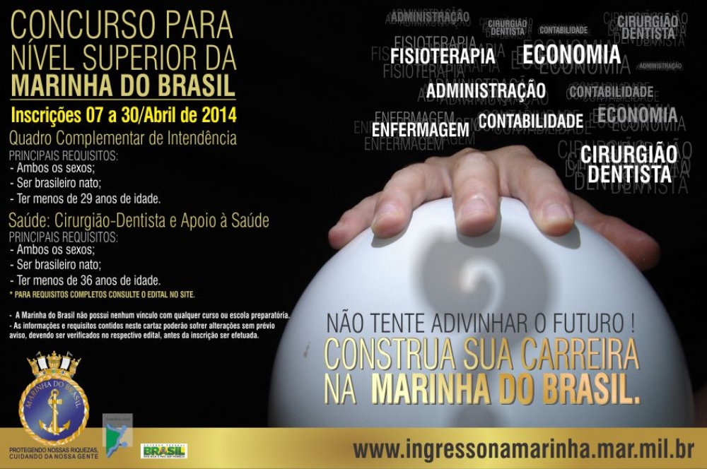 Os interessados em seguir carreira militar devem correr. As inscrições para três Concursos Públicos de nível superior encerram na próxima quarta-feira (30/04). A inscrição poder ser realizada no site da Diretoria de Ensino da Marinha (DEnsM), ou em um dos Postos de Inscrição (Consultar Edital).